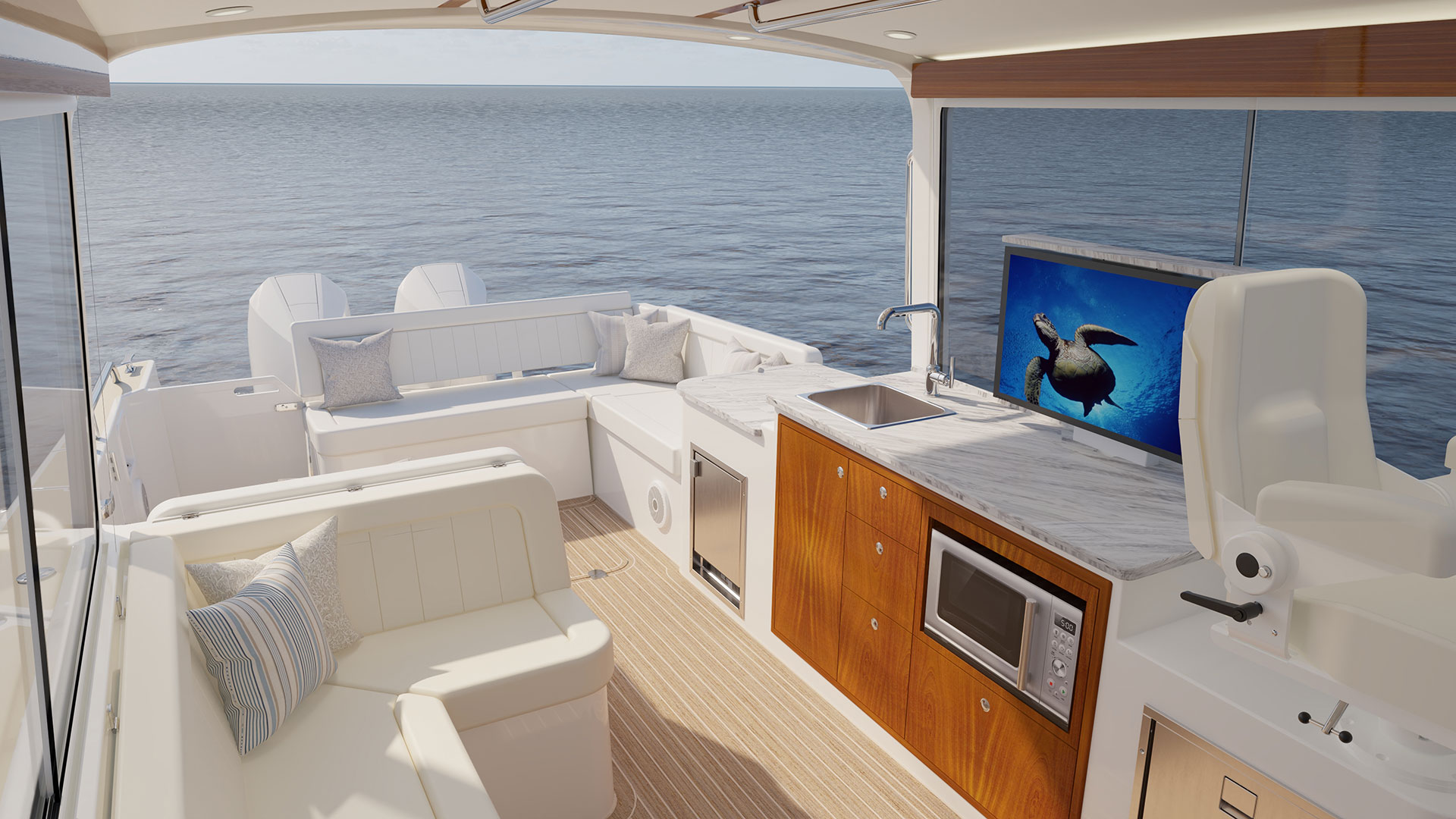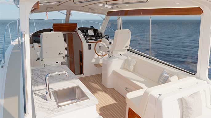 Should the weather take a turn the indoor/outdoor pilothouse adds protection from the wind, sun and spray and delivers versatile weekend getaways with 360-degree views.