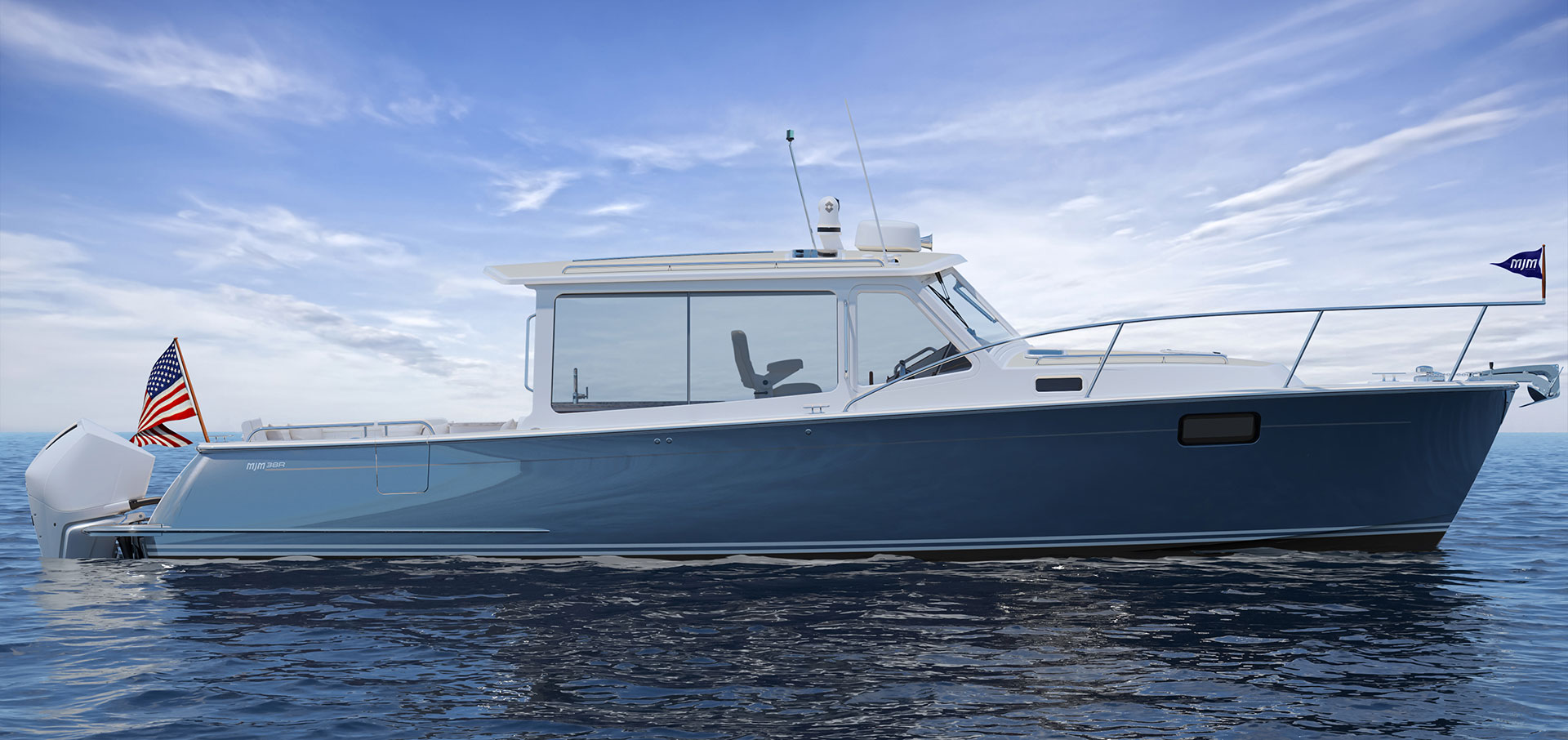 Crafted in the Carolinas, the 38R’s Downeast style design and craftmanship is top of its class. This boat exhibits MJM’s hallmark efficiency, stability, and smooth ride.