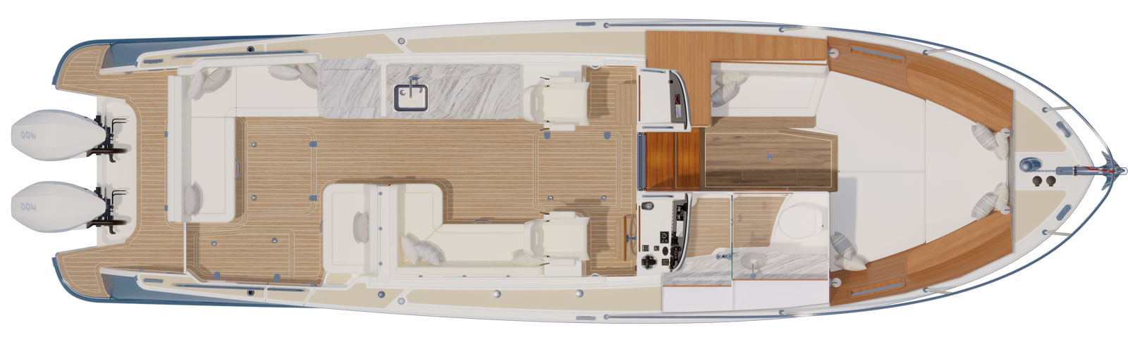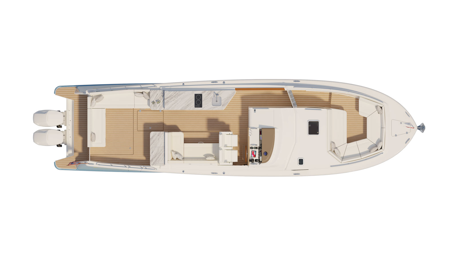 Not to mention helping to keep guests dry. A low center of gravity and narrow beam with chine flats redirect wave and wake energy outward and downward to dampen roll in a seaway. The deep-V entry hull shape slices through waves instead of slamming, pounding, or having each small wave create a mini collision and jolting the crew. This eliminates the fatigue experienced when driving other yachts.