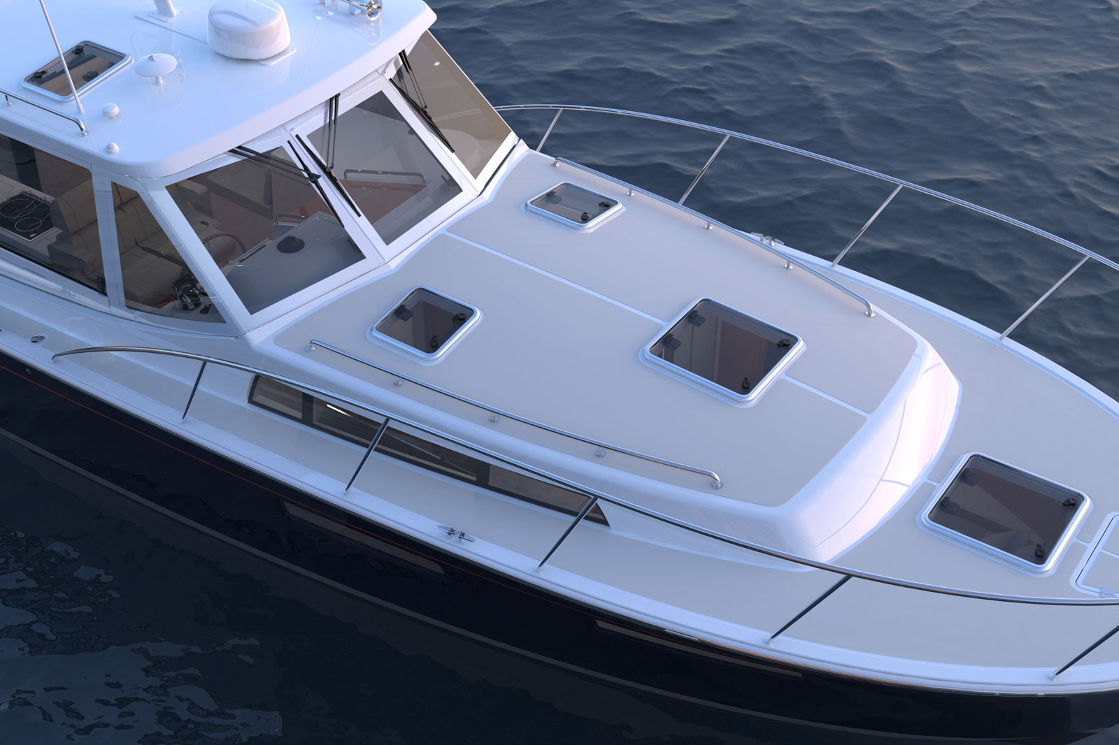 Next were side boarding doors at floating dock level, making boarding safe and easy in any situation. The next most noticeable feature is the protection of the pilothouse, but taking it to the next level is the fact that you can open it up to 360 degree access to your surroundings.