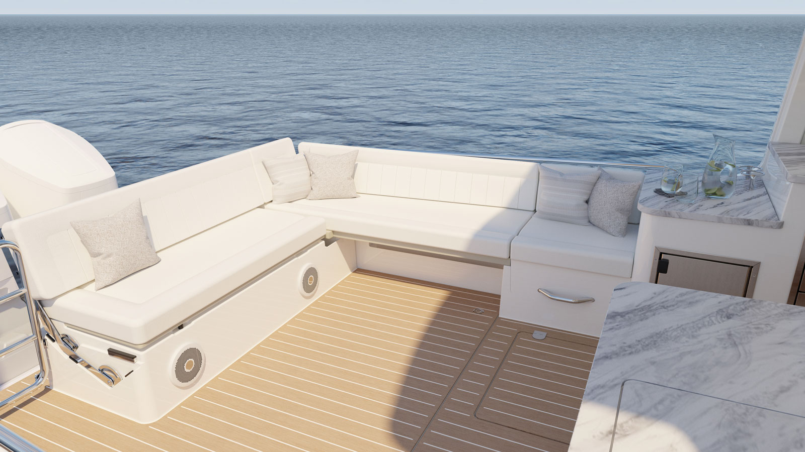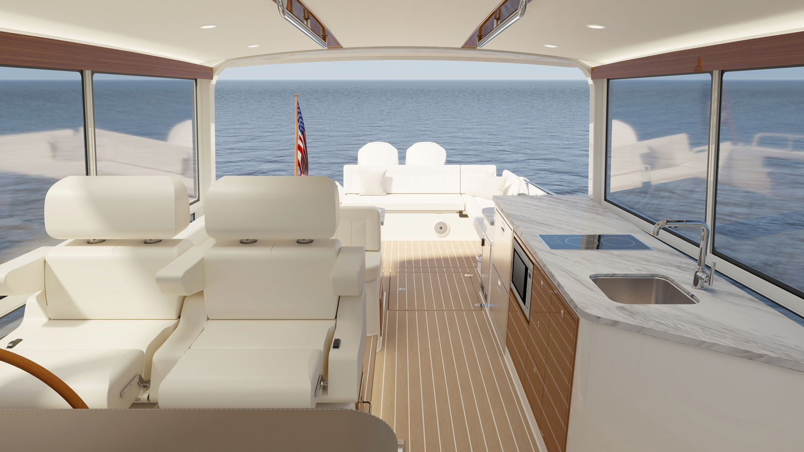 Integral to the overall design was the onboard experience, how does the space interact with people, the flow, and ergonomics. Unique to an MJM is the innovative flush deck design. This eliminates steps and provide a single level from the transom to the helm.