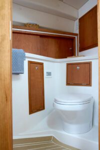 Featuring four distinct social areas and a galley-up layout with the protection of the MJM indoor/outdoor pilothouse, the MJM 47X offers a versatile and efficient design. Below deck, you'll find a spacious v-berth and a yacht-sized head with a glass-enclosed shower.