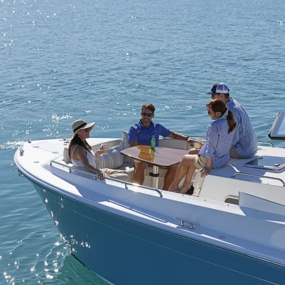 Twin Mercury 600 HP Verado outboards or Volvo D6 440 HP with DPI drives deliver 50+ mph capability with responsive, intuitive control.